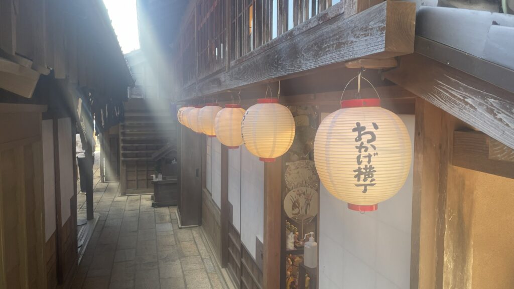 Okage Yokocho near Naiku—an Edo-style street lined with local eateries, craft shops, and a lively atmosphere reflecting Ise’s hospitality.